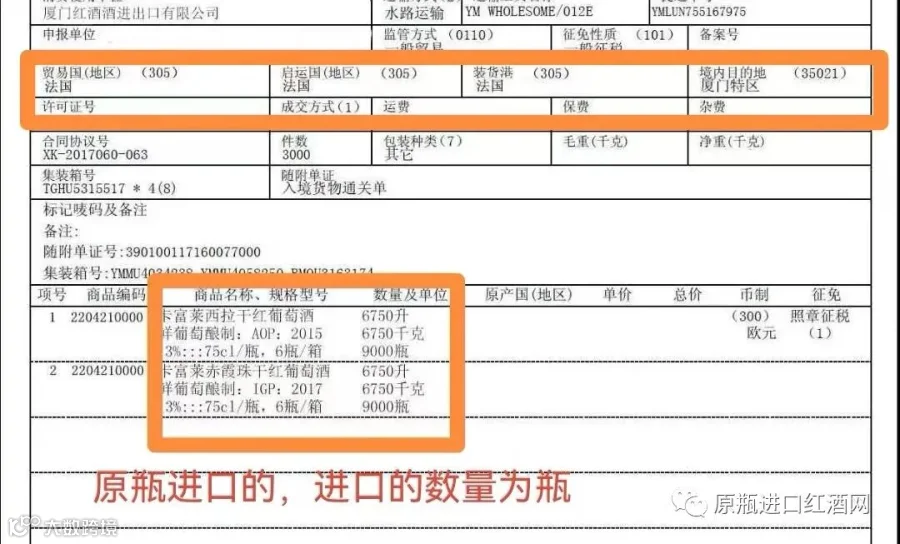 5看报关单和入境货物检验检疫证明:是否与此酒信息相符(进口商在向消费者出示报关单时通常会将价格遮盖属正常),原瓶原装进口酒报关单上会有,启运国,装货港和到达目的地,数量应该是瓶!客户购买时可让商家出示报关单和检验检疫证明!