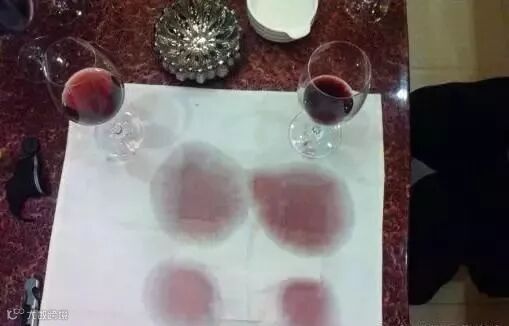 假冒葡萄酒由于是用苋菜红等化工合成色素勾兑而成的,色素颗粒大,会沉淀在餐巾纸的中间,而水迹不断往外扩散,红色区域跟水迹之间分界明显,消费者凭此可以很简单地辨别真假葡萄酒。