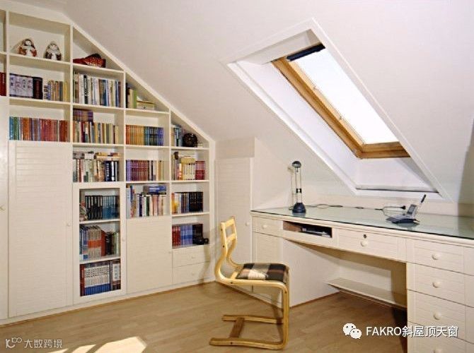 斜屋顶给人视觉上造成一种障碍感,这是空间的大忌,可以在斜坡低于1.5米的地方,设计一个书架和一个带隐形门的储藏间,将低矮的斜角包裹起来。这样,斜屋顶房间不仅变得柔和起来,起伏的墙体线条也充满了艺术感。迷你书房,独享静谧,配上斜屋顶天窗,阳光照射进来,在这里喝下午茶是一种享受。