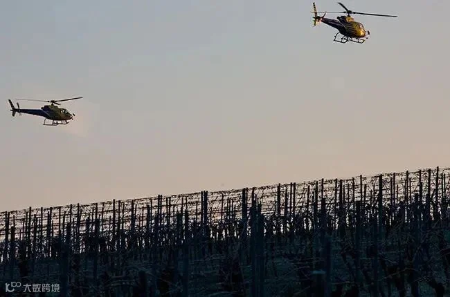 很多经济条件比较好的酒庄,会出动直升机。众所周知,直升机在发动时,其顶部的旋翼能够加速空气的运动,形成较强的风速和风力。在遭受霜冻灾害的葡萄园中动用直升机,其原理与风机一致。特别的是,直升机可以有针对性地移动,但使用成本较高,一般比较少见。