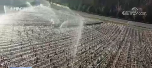 给葡萄喷洒水滴。当水结冰时,它可以向植株的组织器官释放出一些潜在的热量,保护新芽和新枝不受霜冻的伤害。