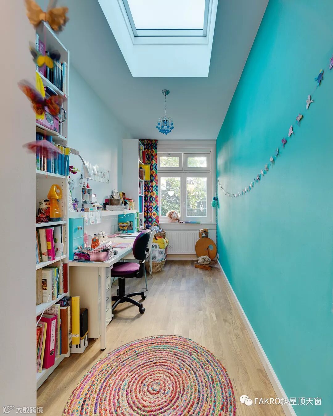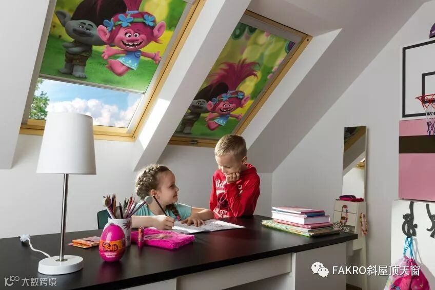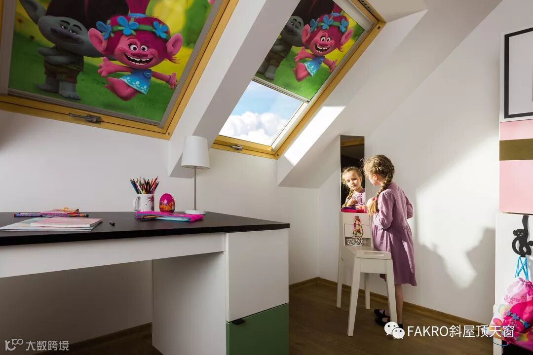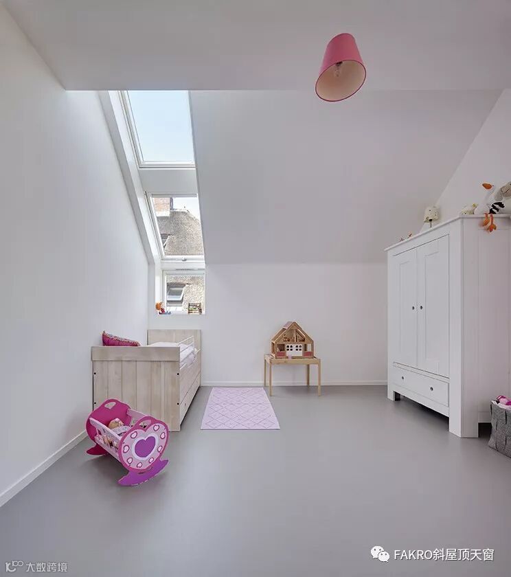 大量的自然光通过fakro天窗照射在白色的墙壁上,达到了很好的光学效果。这个小女孩的房间里装饰比较简单。装饰物以粉红色系为主,结合白色墙壁的光学效应,让整间房子充满了粉红色,非常温馨舒适,这样的环境也将伴她茁壮长大。