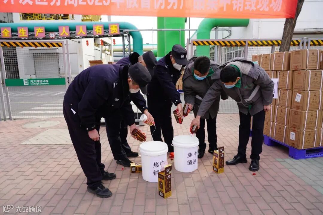 活动中,经开区公安分局民警将侦结案件中查扣的400余箱假冒酒类和假冒注册商标、包装材料等涉案物品进行逐一清点、核对、登记后,交由销毁方进行破碎,确保每一瓶酒都完全彻底销毁。