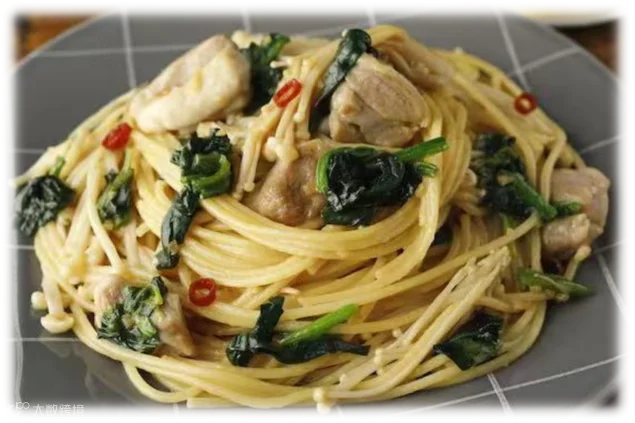 1.意大利面煮熟备用。菠菜和烟熏鸡肉片解冻。
