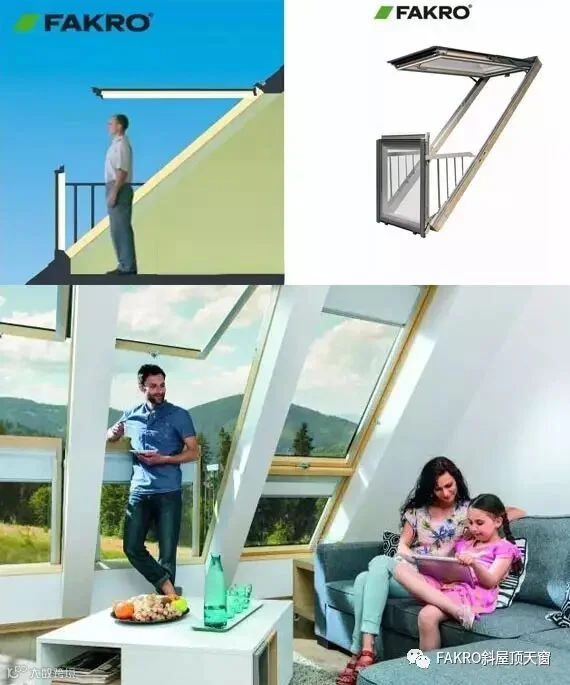 FAKRO阳台窗是一款技术创新型的窗户,当打开窗扇时,会在阁楼上创造出一个阳台空间。上部天窗用中上悬设计,上部窗扇向上开启至45°,下部窗扇向前倾斜开启并且配有防护栏。窗户通过安装在上部窗扇下方的优雅把手操作。阳台窗配备V40通风口,同时内外部均有多种附件可选。