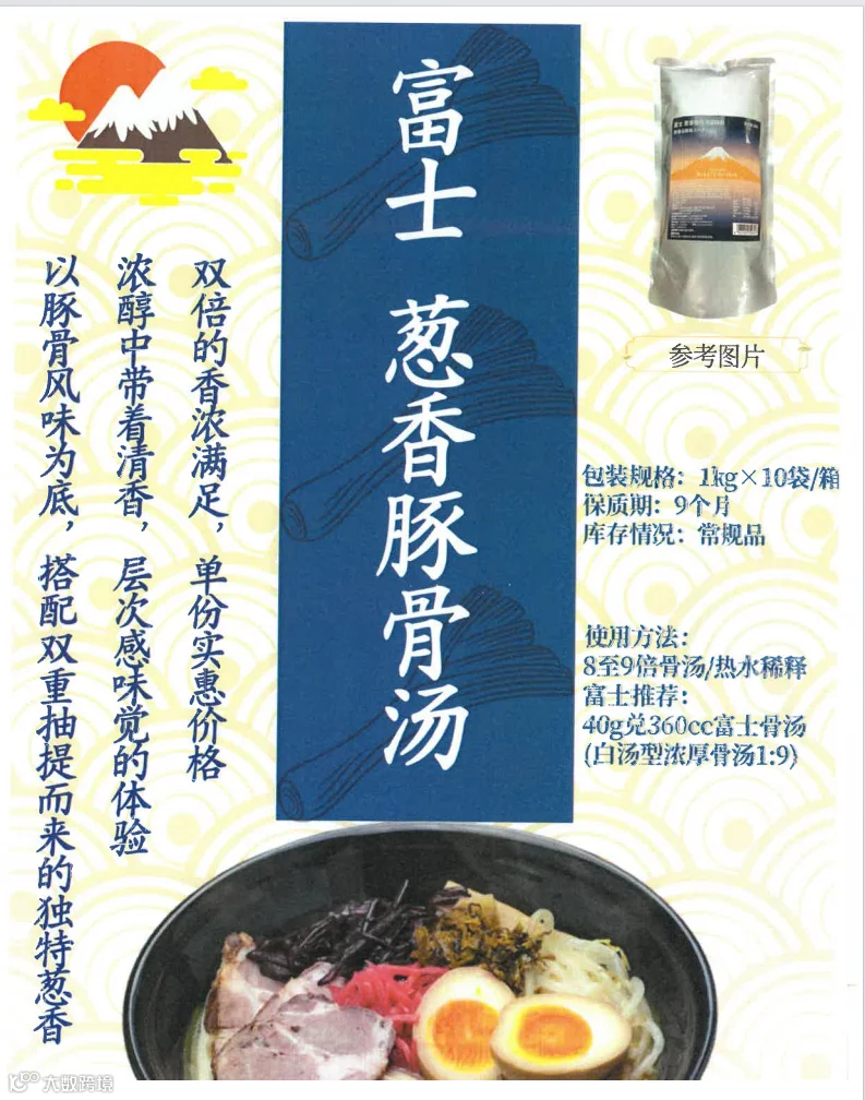 本品是一款以浓郁豚骨风味为基底,通过双重抽提工艺释放独特土葱香气的汤底新品。浓醇与清香交织,口感层次丰富。以单份实惠价格,提供双倍香浓满足。只需简单稀释,方便快捷。