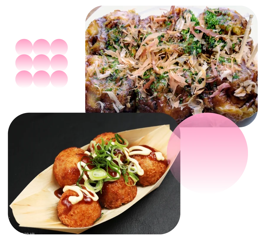 圆滚滚的章鱼烧内含精选粒章鱼粒。外皮香脆,内里软绵多汁!