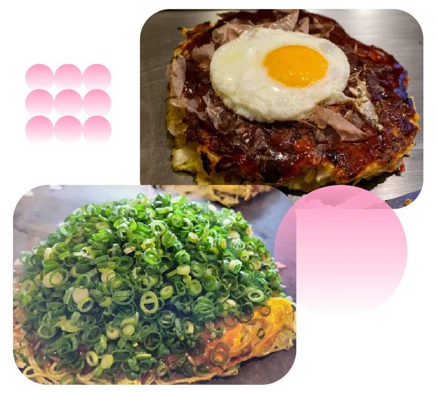 ふっくらぶ厚い生地に焼き上げた、食べ応えのあるお好み焼です。アツアツの鉄板で焼いたときの香ばしさと肉のうまみがじわっと広がる、やみつきの味わいを楽しめます。