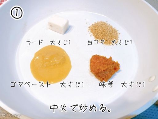 ①将猪油1大勺,味噌1大勺,白芝麻1大勺,芝麻酱1大勺放入平底锅中,开中火炒。