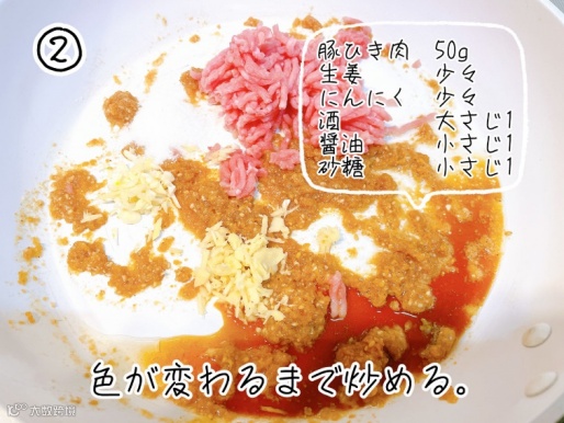 ②加入猪肉糜50克,姜末、蒜末少许,料酒1大勺,糖1小勺,酱油1小勺,炒至变色。