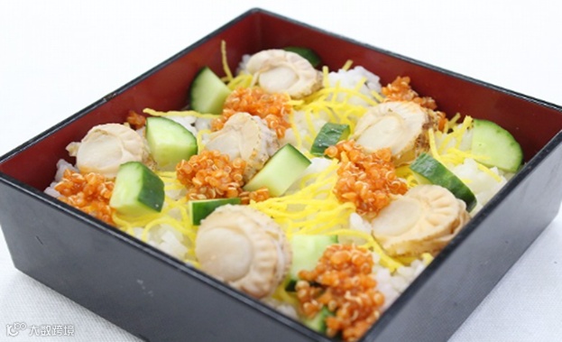 寿司米(コメ) 80g、寿司醋(すし酢) 15ml、锦丝蛋丝(錦糸卵)10g、冻煮全贝(ほたて) 20g、飞鱼籽(とびっこ) 15g、蟹肉(かにかま) 20g、星鳗(アナゴ) 20g、黄瓜 适量