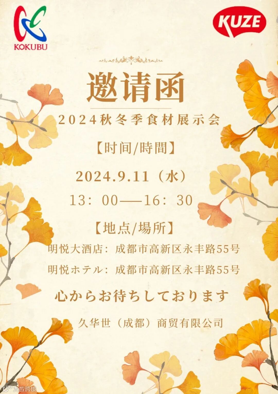 パ一トナ一の皆様、 9月11日(水)、成都高新区永丰路55号[明悦ホテル]にて「2024秋冬食材展示会」を開催いたします。皆様のご参加お待ち申し上げております。