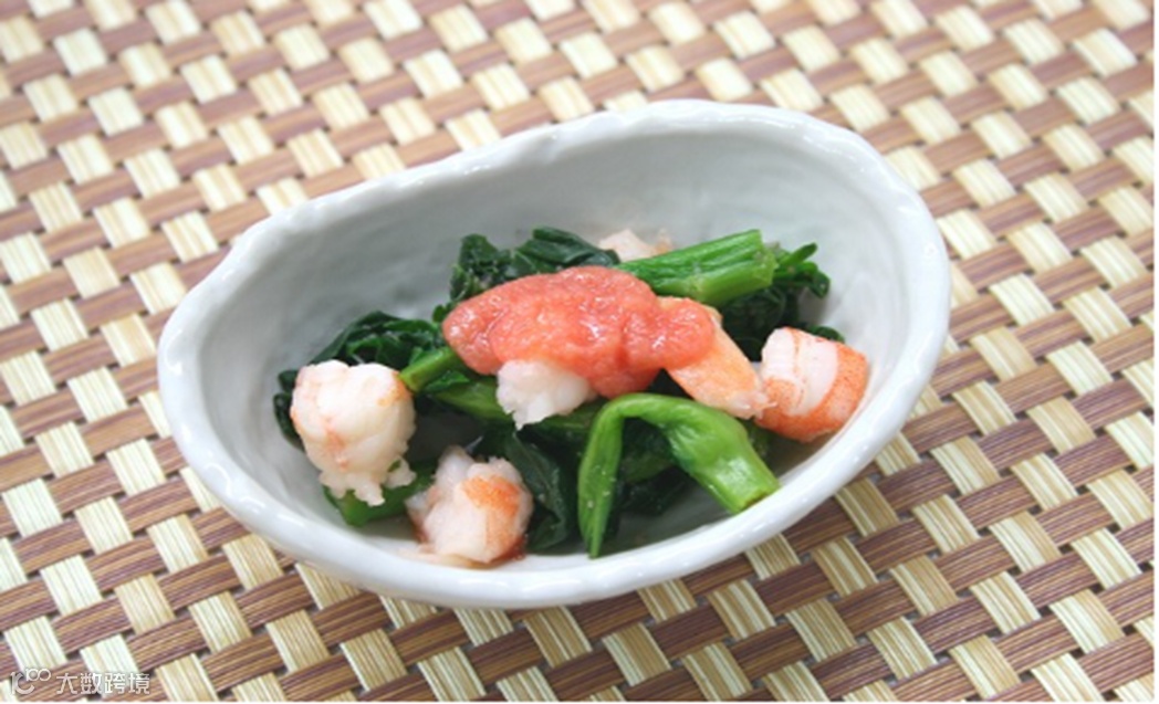 菜苔(菜花)10g、辣味明太子 20g、熟虾仁 5g、鲣鱼白酱汁 3ml