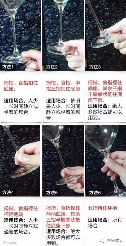 持杯时请切勿直接握住杯肚。手握住杯肚不仅会在酒杯上留下指纹,影响美观,手的温度还会将葡萄酒捂热,导致葡萄酒温度过高而破坏了其风味。