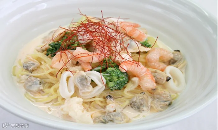 拉面 (ラーメン)1块、沙拉酱(マヨネーズ) 50g、豆浆(豆乳) 150ml、海带调味料(昆布だし) 3g、海鲜五合一(海鮮ミックス) 50g、西兰花(ブロッコリー) 10g、辣椒丝(糸唐辛子) 0.2g、辣味明太子(辛子明太子) 20g