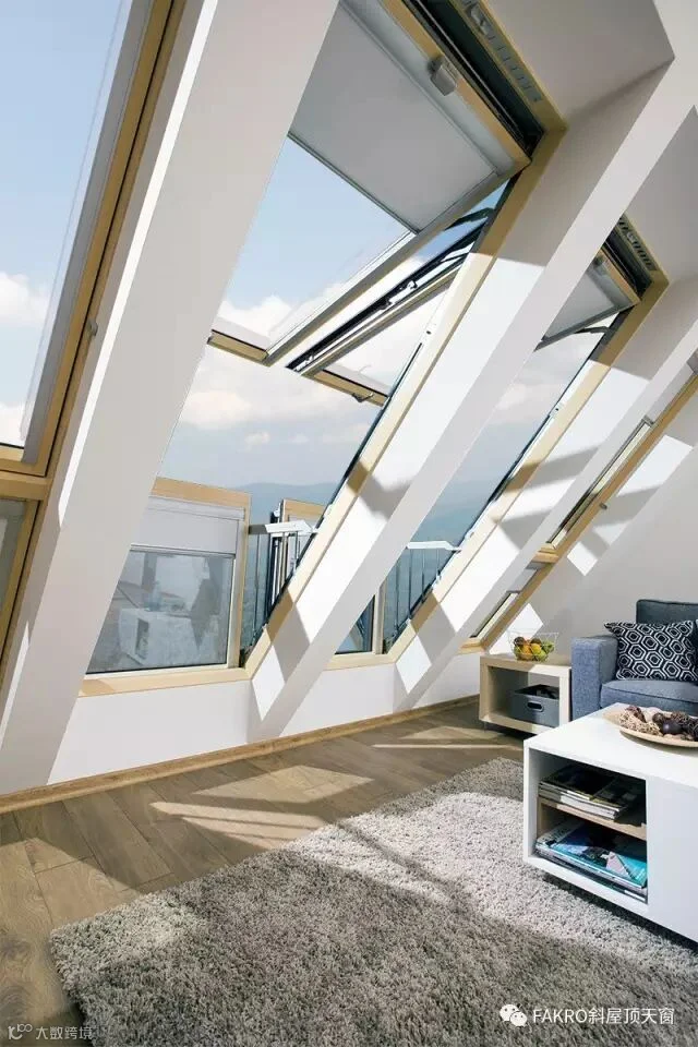 创新型的屋顶天窗,全部打开时可创建一个阳台,上部天窗用中上悬设计,底部天窗向外开启并配有防护栏,可在45度以内进行调整。