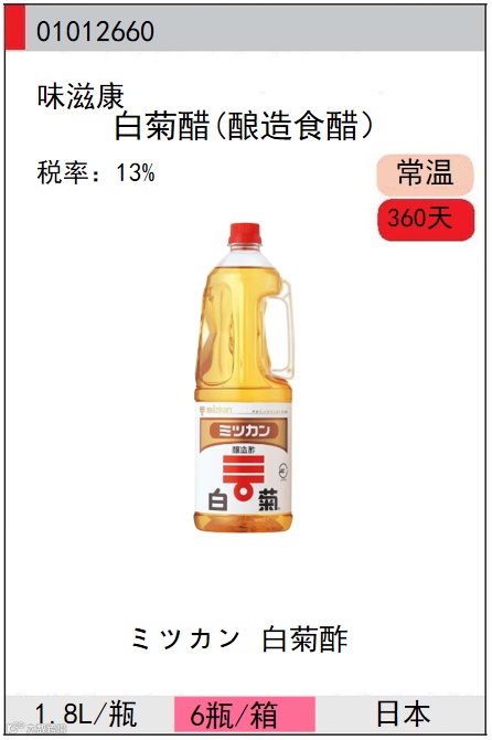 味滋康拥有200余年的食醋酿造史,在日本的食醋市场占有很大份额。白菊®作为其明星产品之一,与寿司饭的搭配堪称绝妙。它由大米、酒精、酒糟等原料制成,清爽无杂味,能更大程度的衬托出寿司饭的味道,在日本银座“寿司龙介”(鮨竜介)寿司店等世界各地的寿司店都很受欢迎。除适用于寿司外,白菊®也适用于其他想突出食材本味的菜肴。