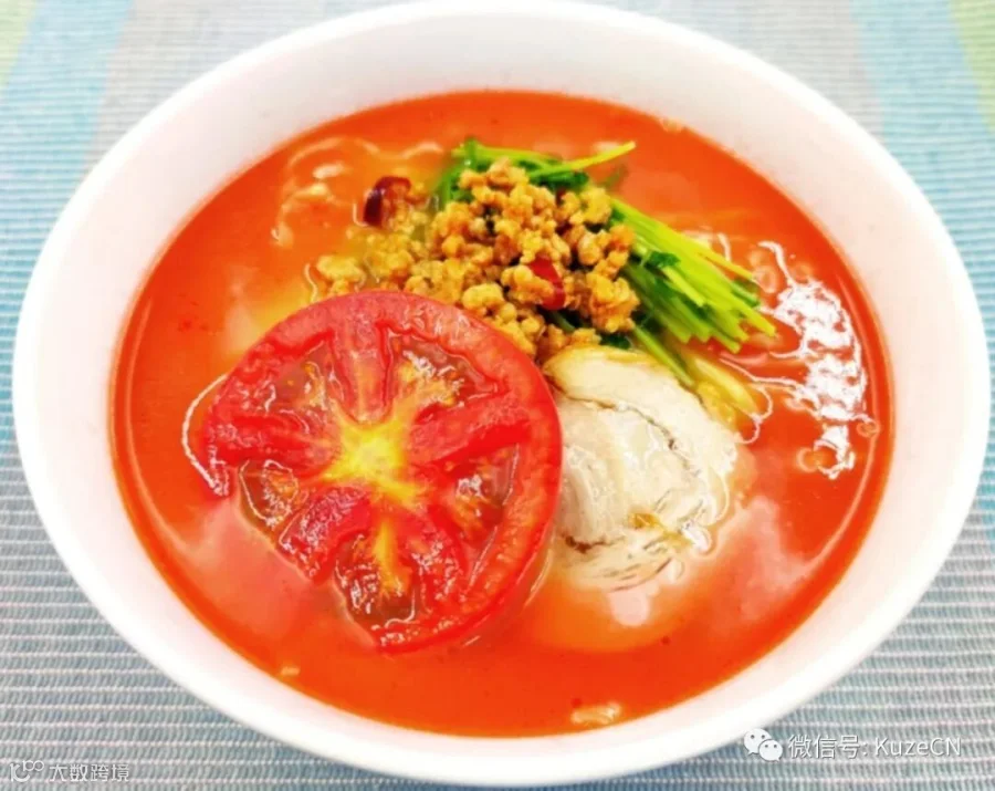 爆辣酱 20g、番茄调味液 50g、开水 300g、日式切面(粗直) 130g、叉烧 1片、番茄 适量、小葱 适量、猪肉末 适量