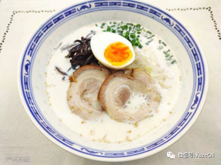 ⑤ 放入拉面浇头叉烧、木耳丝、调味竹笋、小葱和半个糖心蛋等摆盘,一碗美味的博多猪骨拉面就完成啦。