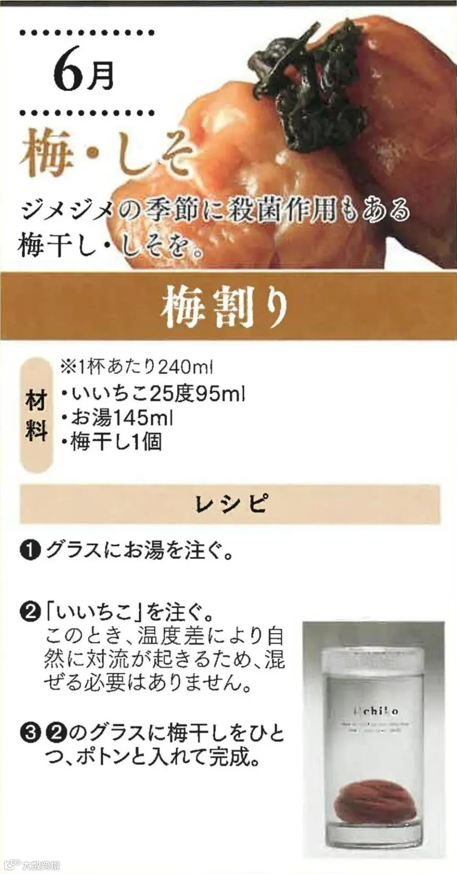 梅干酒不仅有清爽的口感,梅干还可以让烧酒的酒精味变得温和。不习惯喝酒和酒量较弱的人也可以安心享用。