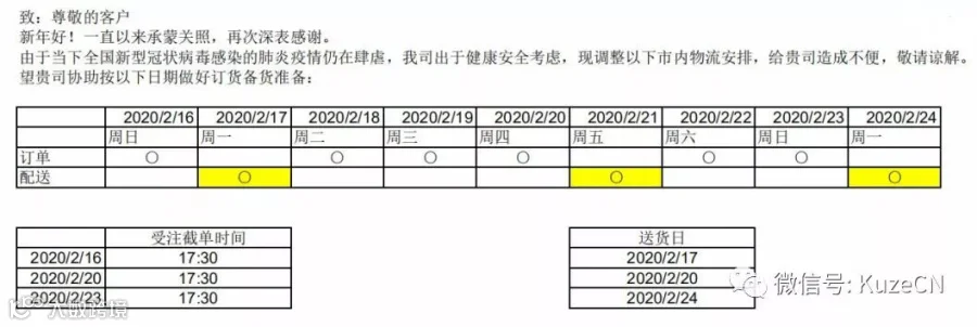 日頃より格別のご高配を賜り、誠にありがとうございます。この度のコロナウイルスによる肺炎の影響によりご注文受付時間とご納品について下記のスケジュールとさせて頂きます。ご不便をお掛けいたしますが、何卒ご了承頂きますようお願いいたします。