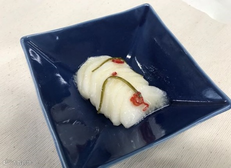 ① 白萝卜切片,切好后加入水、食盐和白醋中。放入冰箱冷藏腌制24小时。