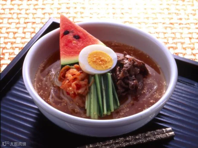 ③将煮好的冷面装入碗里,摆上①辣白菜(白菜)、水煮徽菜、西瓜。