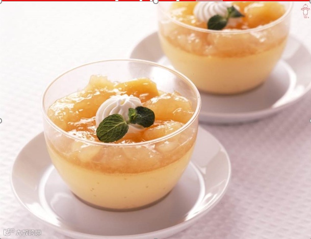 丘比布丁液 500g、白桃果酱不加糖 125g、牛奶 500g、鲜奶油 适量、薄荷 1片