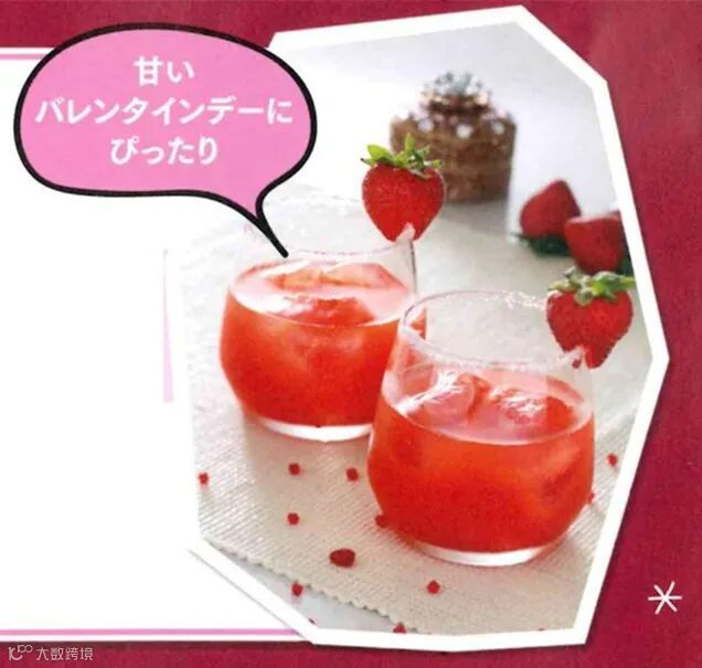 ③在杯子中加入冰块,再把②倒入杯子,并在杯子边缘装饰上草莓