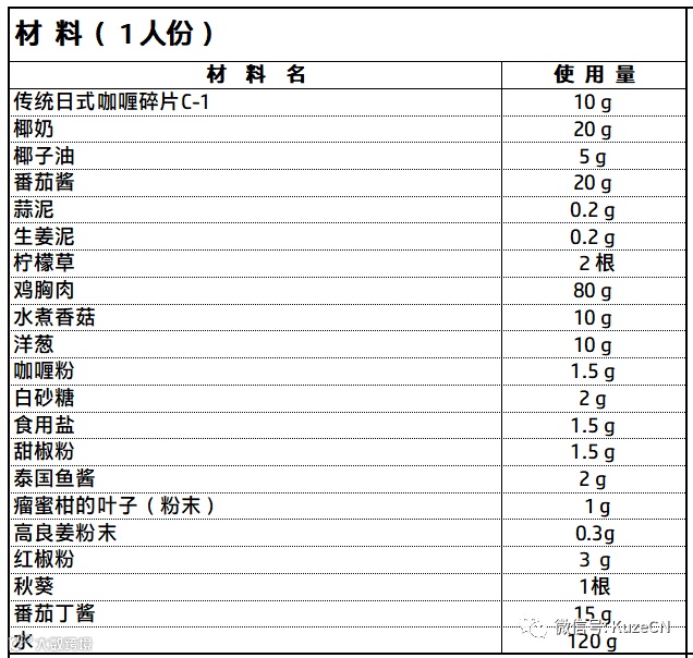 使用25种香辛料混合调制的,日本制造咖喱粉,再添加与咖喱好搭配的苹果的甜味以及番茄的稍微酸味、使味道更加浓醇美味对咖喱不可缺少的而且带着清爽香味的香辛料、香菜和孜然配制而成风味丰富的日式咖喱碎片。
