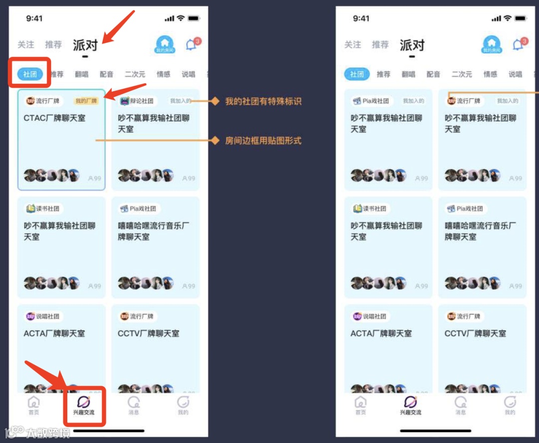 2.兴趣交流→派对→社团tab→显示「我的厂牌」标识的房间