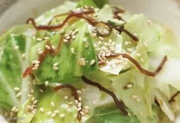 2.把撕好的卷心菜放入塑料袋中,加入白芝麻、盐渍昆布、芝麻油各一大勺,酱油半小勺,盐少许,大蒜泥(从管状包装中挤出)1 - 2厘米,然后上下摇晃袋子,使调料均匀裹在卷心菜上。等到卷心菜变软后,挤出袋子里的空气,封好口,放置10分钟以上即可。