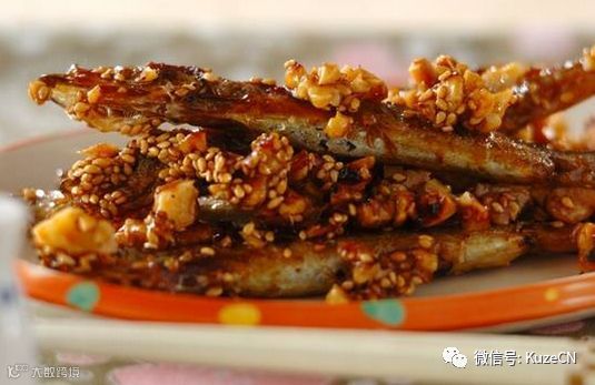 3 最后加入核桃仁、白芝麻。避免粘在一起,将多春鱼移到烤箱用纸上冷却,随后摆盘即可。