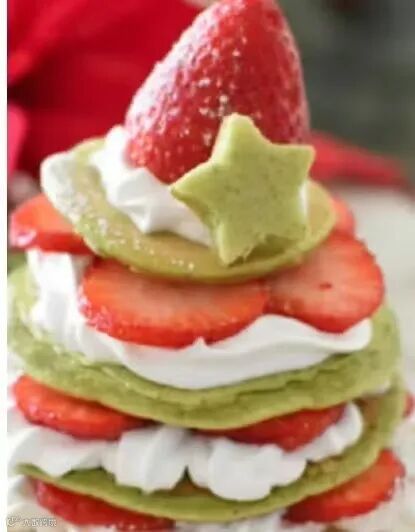 次に大きなホットケーキをその上に重ねて、同様に飾り付けクリスマスツリーの形に積み重ねる。