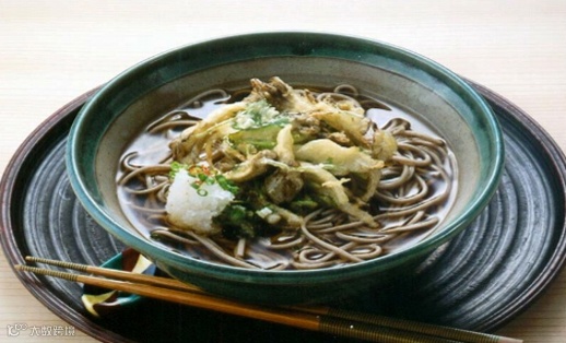 荞麦面(そば) 1份、荞麦面汁(そばつゆ) 50ml、舞茸(マイタケ) 15g、天妇罗粉(天ぷら粉) 10g、白萝卜泥(大根おろし) 10g、七味粉(七味) 0.2g、水 300ml