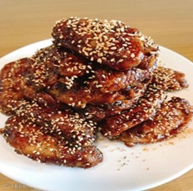 ③ 将炸鸡翅蘸在烧鸟汁里,最后撒粗黑椒,白芝麻,即可。