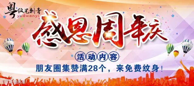 粤纹艺东莞店一周年年庆,为感恩新老顾客的支持,凡是转发此文到朋友圈集赞满28个,凭截图到店可享受免费纹身(简单线形小图5*5以内黑色以内只收颜料费80,彩色只需要100块),其他尺寸图案一律打九折。