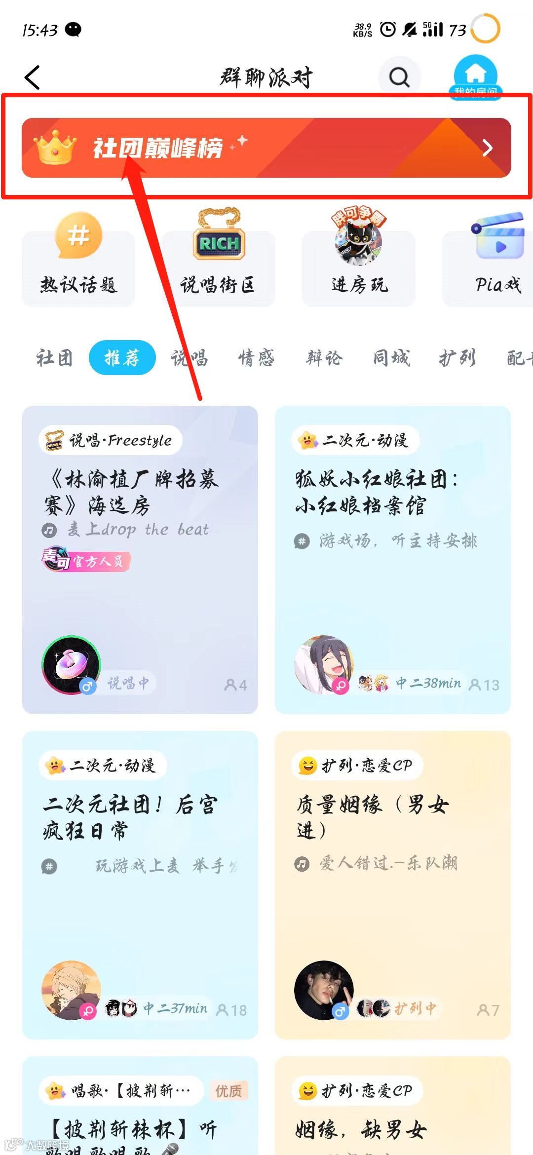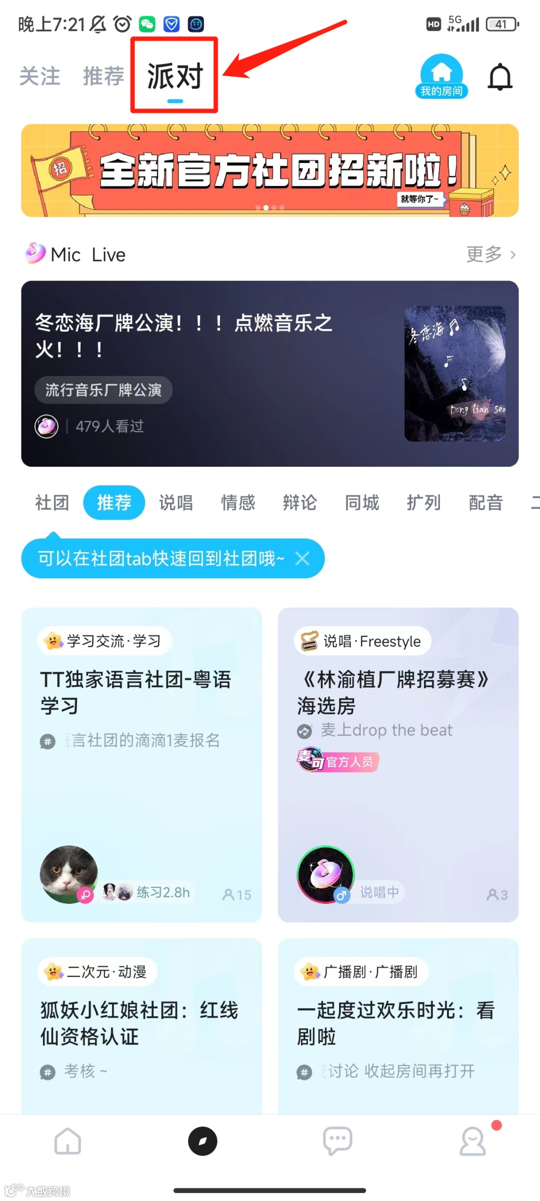 方法一:打开APP:TT语音,首页推荐→主题派对→页面上方,即社团/厂牌巅峰榜