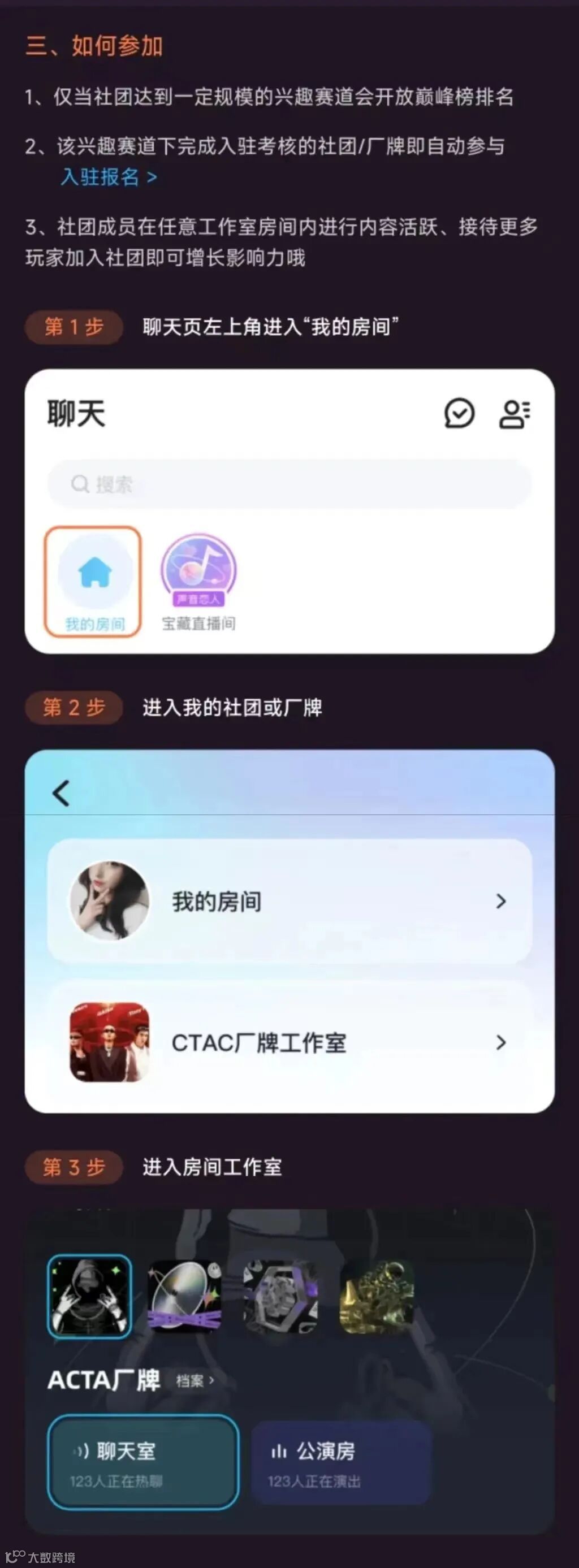 社团/厂牌 提升影响力条件:社团/厂牌关注量越多,发布期间,社团/厂牌工作室房间&主理人房间内,活跃数据(即开房次数、天数、进房人数、房间内人均停留时间等综合数据)越高,影响力越大;