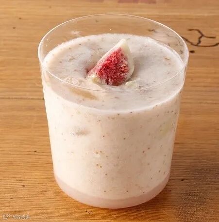 ①将冷冻无花果(65g)、椰浆、水、糖浆和肉桂放入搅拌机中,搅拌均匀后倒入玻璃杯中。