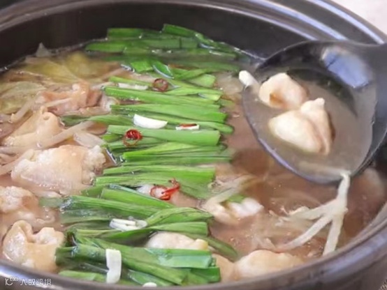 ⑤ 开盖加入韭菜段、蒜片、辣椒圈即可。