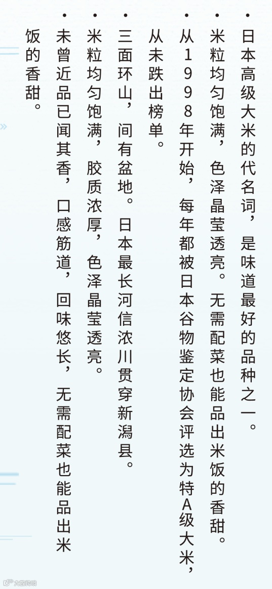 海禾滩日料专供大米:充分利用东港市地处北纬40.13度的自然优越地理环境,经过五年的培育、试种,到现在的大规模种植,形成固定的米种优势。此米口感劲道、Q弹粘糯、营养价值丰富,久放不回生,目前旺销于全国各地,备受好评。