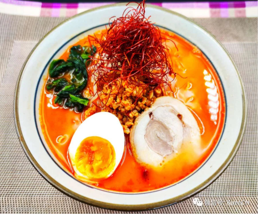 日式切面(东京曲面) 130g、荏原激辛麻辣调味液 45g、稀释后的猪骨浓汤(IPS猪骨浓汤 72g,水 288g)、叉烧 1片、猪肉糜 20g、辣椒丝 1.5g,豆芽 20g,菠菜 20g,大葱丝 5g,溏心蛋 半个