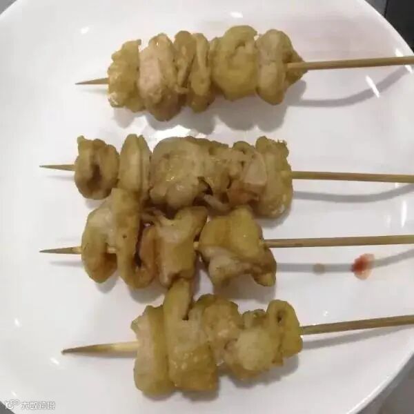 3:横膈膜串、猪心串、猪肝串烤大约7-8分钟。