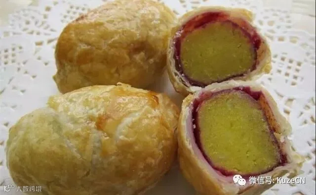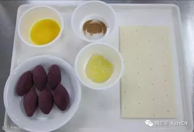 日水迷你山芋仔6个,冷冻派皮1张,苹果酱1大勺,肉桂粉适量,蛋黄1个、水1小勺。