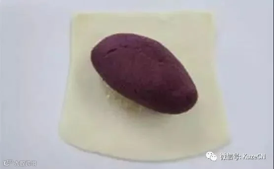 把等分的派皮拉伸到可以包裹一个山芋仔的大小,涂抹上搅拌好的苹果酱。把山芋仔放在派皮中央。