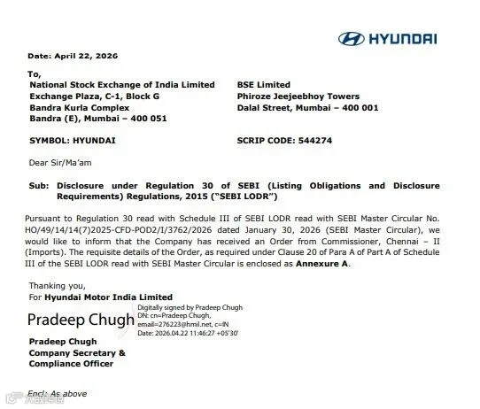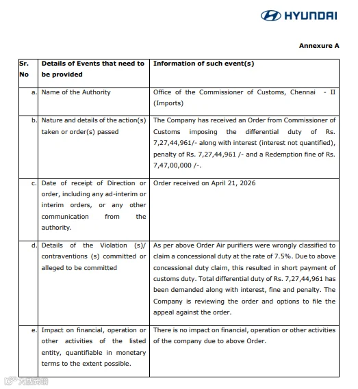 4月22日,超律志从孟买证券交易所(BSE)披露的监管文件获悉,现代汽车印度有限公司因进口空气净化器时商品归类错误,被印度金奈第二进口海关专员办公室认定适用了错误的7.5%优惠关税税率,导致少缴关税。据此,印度海关开出总额逾2.2亿卢比(约合人民币1600万元)的罚单。