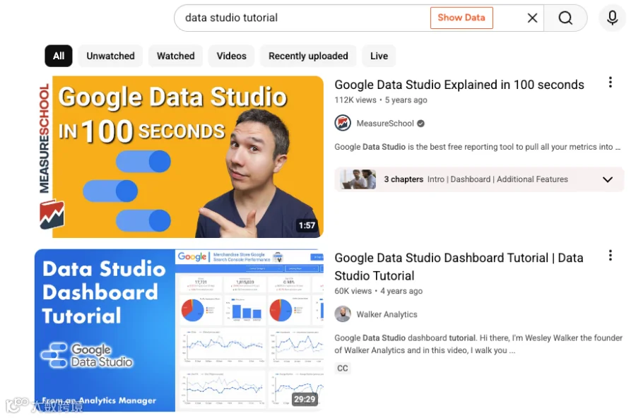 如上图所示,搜索“Data Studio 教程”即可获得大量入门指南,零基础用户也能快速掌握。
