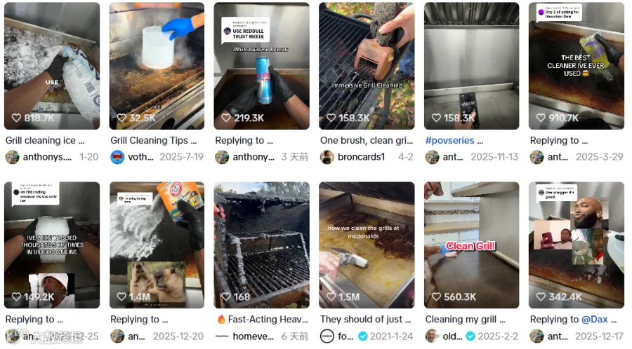 在TikTok上,通过极具视觉冲击力的画面,Drayvorx成功地将低频的“烤架清洁”任务,转化为高频“解压娱乐”内容,实现病毒式传播。