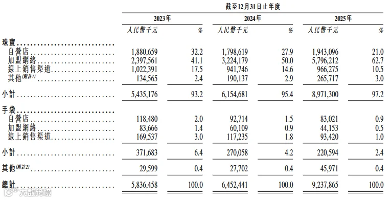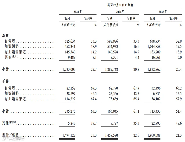 渠道方面,潮宏基由直营主导转向“直营做精、加盟做广”的轻资产模式。截至2025年末,珠宝业务门店总数达1670家,全年净增159家:自营门店184家(净关55家),加盟门店1486家(净增214家)。该策略加速下沉市场渗透,并成功进驻SKP、国金、太古里、万象城等顶级商业体。